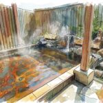 地獄をテーマにした、地熱を利用した温泉施設 赤や青の湯が入った浴場、足湯、土産屋、軽食店がある