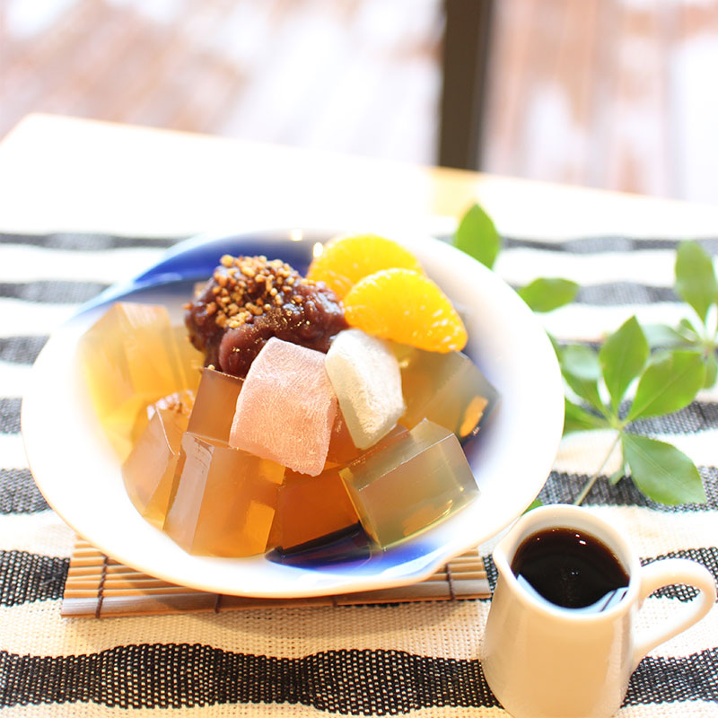 蕎麦膳セットについてくるあんみつが蕎麦を使った珍しい寒天を使用する琥珀色のあんみつ(蕎麦甘)となっており大変評判になっている