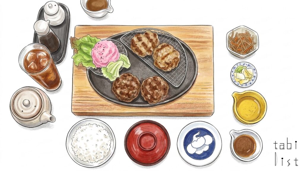 看板メニューの神徳ハンバーグは、肉の風味をまっすぐに感じられる一皿です。つなぎを抑えた仕上がりで、噛むほどに旨みが広がり、肉汁の豊かさも印象に残ります。味付けは特製のタレや塩でシンプルに整えられ、その時々で異なる表情を楽しめます。また、複数の種類を味わえる食べ比べセットでは、牛や豚、羊といった素材ごとの個性が際立ち、挽肉の奥深さに気づかされます。