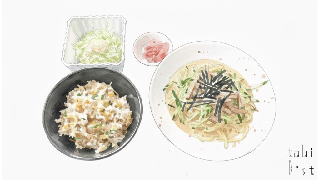 冷めんと並んで常連さんに愛されているのが、中華そばです。こちらは醤油味の昔ながらの懐かしい味わいが特徴で、シンプルでありながら、また食べたくなる飽きのこない味として、リピート率が非常に高いメニューです。そして、喫茶店時代の名残を受け継ぐオムライスも隠れた人気メニューです。中のケチャップライスには鶏ガラスープが使われていて、滋味深く優しいコクが感じられます。鶏肉と玉ねぎだけのシンプルな具材を、薄焼き卵がふんわりと包みこみ、どこかお母さんの手作りを思わせるような、ほっとする味わいが魅力です。