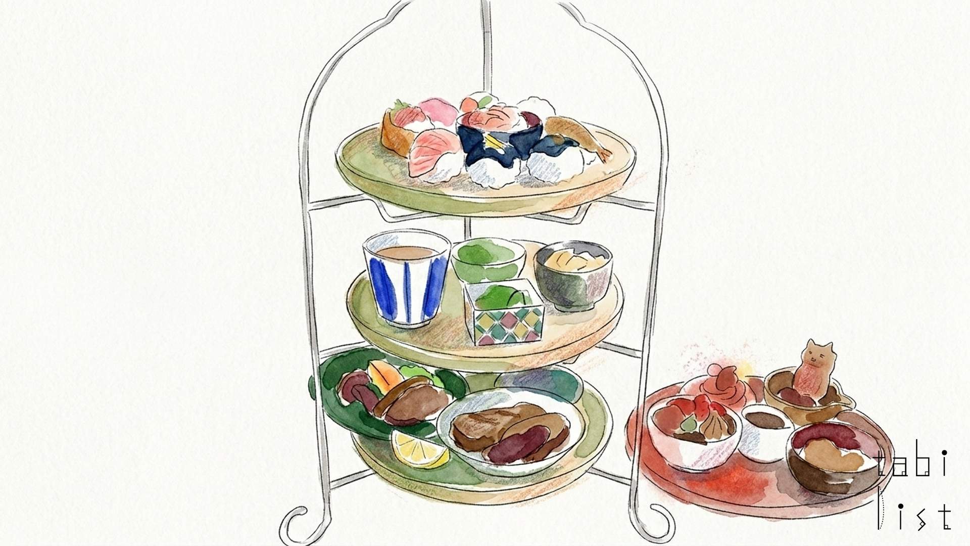 茶房松緒ならではの特別な魅力は、見た目も華やかな和のアフタヌーンティーでございます。三段のティースタンドには、季節ごとに変わる彩り豊かなおばんざいと、かわいらしい手まり寿司が並び、それに加えて和のデザートプレートが添えられています。様々なお料理を少しずつ味わえるので、女性の方を中心にとても人気を集めています。また、甘味に使われる素材へのこだわりも深く、あんみつの寒天は伊豆七島の神津島産の天草を天然水で丁寧に煮出した自家製のものでございます。黒蜜には沖縄・波照間産の純黒糖を使い、じっくりと煮詰めて作られたコク深い味わいです。さらに、お餅は新潟県魚沼市の契約農家から届けられる高級もち米「わたぼうし」を毎朝つきたてで提供しています。お抹茶は文久元年創業という長い歴史を持つ京都宇治の「山政小山園」のものを選び、注文ごとに丁寧に点てています。