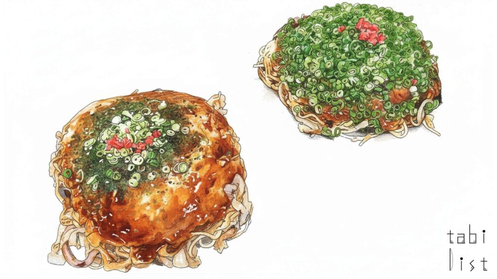 お店の看板メニューとして特に知られているのが、肉玉イカ天ネギです。広島流お好み焼きは、小麦粉を溶いた生地を薄く広げ、その上にたっぷりのキャベツ、豚肉、そして中華麺(そばまたはうどん)を重ねて蒸し焼きにし、最後に卵でとじるのが伝統的なスタイルです。この定番の製法に、イカの旨みが凝縮されたイカ天と、たっぷりの刻みネギを加えたのが肉玉イカ天ネギで、生地やキャベツの甘みにイカ天の香ばしい風味とネギの爽やかさが加わり、濃厚ながらもやみつきになる深い味わいを生み出しています。
