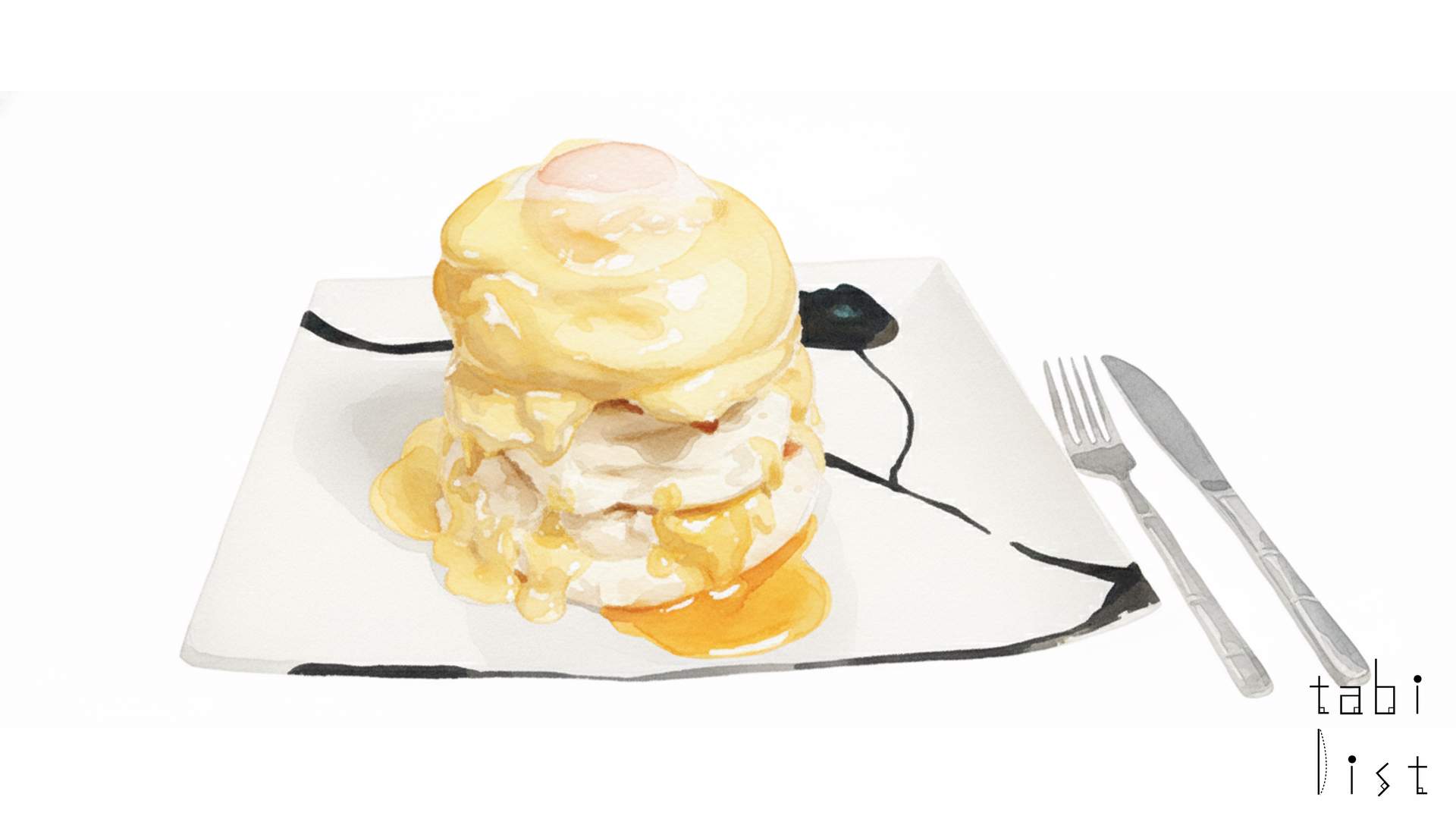 食事系パンケーキとして人気なのは、ベーコンと目玉焼きです。三段重ねのパンケーキの上には、こんがりと焼かれたベーコンと目玉焼きが乗せられ、濃厚なオランデーズソースがたっぷりとかかっています。甘じょっぱい組み合わせが織りなす絶妙なハーモニーは、甘いものが苦手な方や朝食利用のお客様にも愛されています。