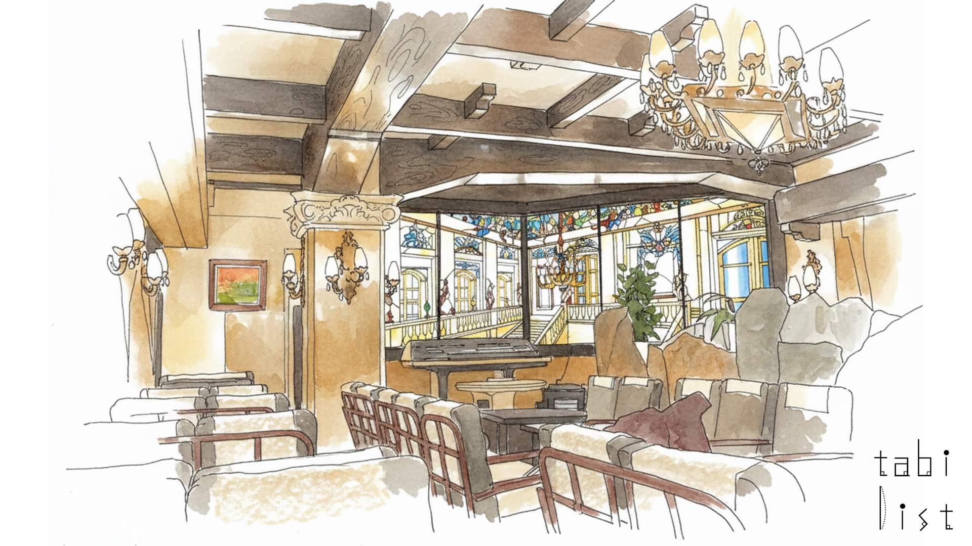 このお店の最大の魅力は、地下空間を豊かに彩る贅沢なインテリアの数々です。天井からは、まばゆいばかりの大きなシャンデリアが下がり、壁一面には、ロシア皇帝の旧城であるエルミタージュ美術館をイメージして作られた巨大なステンドグラスが輝いています。このステンドグラスのおかげで、地下でありながらも店内には奥行きと広がりが感じられ、圧迫感がなくゆったりと過ごせます。また、床には特注の大理石が敷き詰められ、壁にはあえて荒々しい大理石が用いられており、細部にまでこだわり抜いたゴージャスな造りです。かつては仕事の打ち合わせや接待など、ホテルのラウンジのように使われることもあったというほど、その高級感は折り紙付きで、今では映画やテレビドラマのロケ地にもなる貴重なスポットになっています。さらに、店内には創業当時から受け継がれるユニークな伝統があり、コーヒーカップは女性にはピンク、男性にはブルーで提供される心遣いがあります。