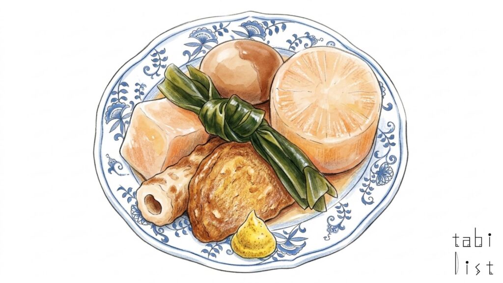 お店の看板メニューである甘口おでんは、厚く大きく切られた大根やちくわ、卵、こんにゃく、結び昆布などの具材に、甘めの出汁がじっくりと染み込んだ、心温まる一品です。一つずつ丁寧に手作りされている素朴な味わいは、訪れるたびにホッとするおいしさです。他にも、山の恵みをたっぷりと感じられる山菜そばや、昔ながらの鶏ガラベースのスープがどこか懐かしいラーメンも、峠を越える人々に長く愛されてきた人気のお料理です。お土産には、ご家庭でも仙岩峠の茶屋の味を楽しめるように、真空パックにされた甘口おでんもご用意しています。