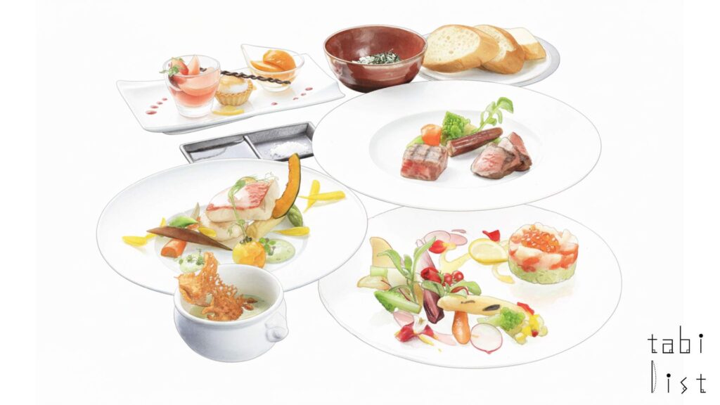 お食事の主役は、地元の伊豆の旬を彩り豊かに盛り込んだナチュラル伊豆フレンチです。夕食はメインディッシュをテーブルへお届けし、前菜やスープ、デザートなどをビュッフェ形式で楽しめるドゥミビュッフェスタイルで提供されます。肩肘張らず、お箸でリラックスしながら味わえるフレンチは、和の要素も取り入れつつ、新鮮な旬の食材の魅力を引き立てた味わいです。メイン料理の一例には、旬の魚と国産牛を組み合わせた創作フレンチ「雅」などがあり、見た目の美しさもあいまって、食べる人の心を躍らせます。また、朝食も静岡県産の食材を使用した洋朝食ビュッフェで、相模湾の景色を眺めながら一日のエネルギーをチャージできます。美しい景色と美食、心と体が喜ぶ温泉とサービスが揃った熱海風雅は、自分らしさを取り戻す大人の休日を過ごしたい方にぴったりの滞在先です。