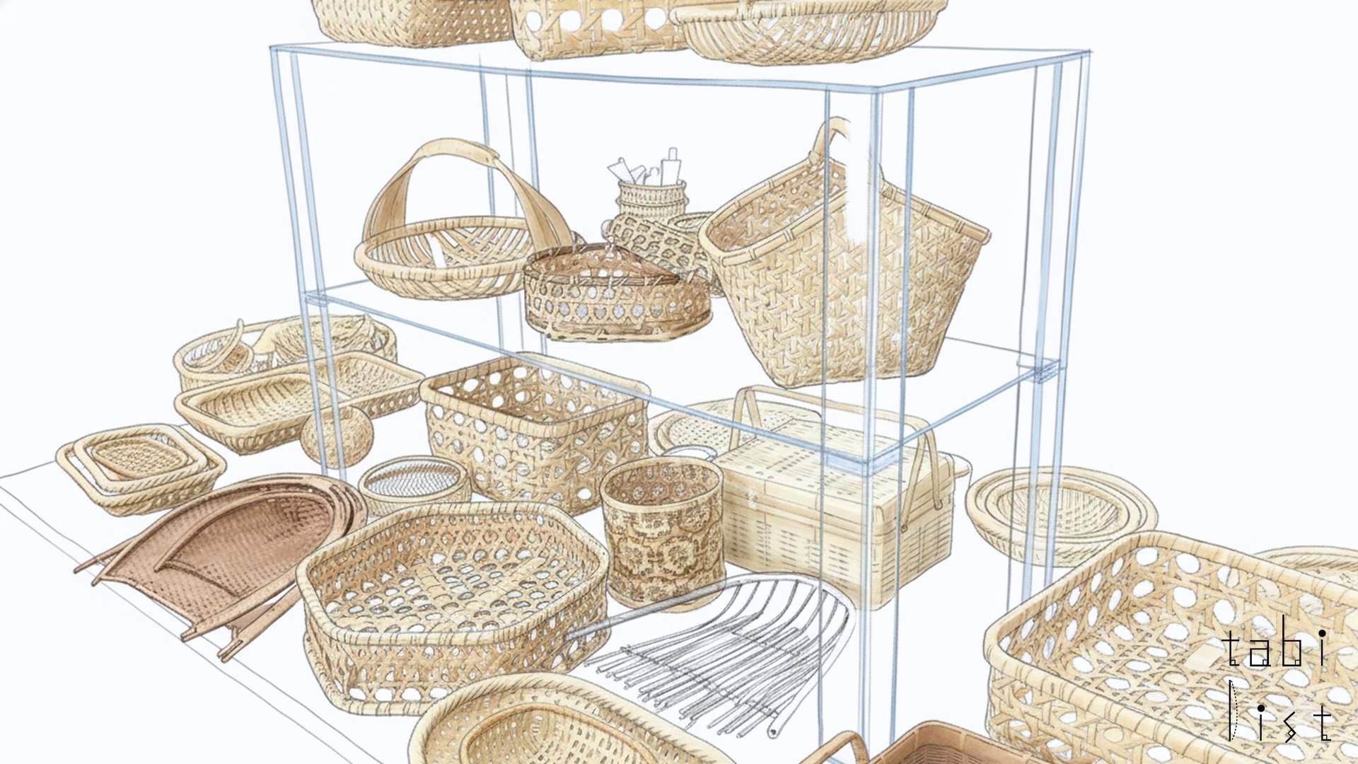 お店の大きな特徴は、店主の確かな目利きによって集められた、作り手の顔が見える作品の数々です。熟練のベテラン職人から、新しい感性を持つ若手作家まで、一人ひとりの作風やこだわりを知り尽くした店主が、その魅力を丁寧に伝えてくれます。かつては農家の副業として作られていた竹細工ですが、明治時代に工業学校が設立されたことで芸術性の高い「工芸」へと昇華されました。店内には、大分県産の真竹(マダケ)を使い、200種類以上もあると言われる緻密な編み技法を駆使して作られた、繊細かつ堅牢な道具が所狭しと並び、訪れる人を竹工芸の深い世界へと誘います。