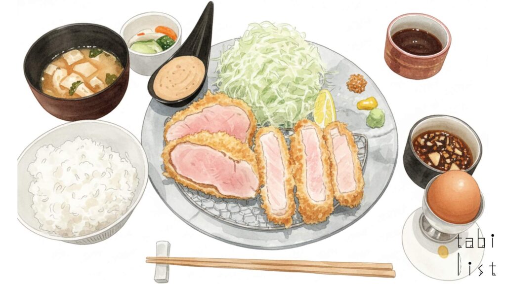 このお店の一番の特徴は、手間ひまをかけた熟成と火入れにこだわる「料理人がこだわった」とんかつが味わえる点です。厳選した豚肉を米油に3日間漬け込んでじっくりと熟成させた後、低温の米油で通常の揚げ時間よりも長く火を通すという独自の調理法を採用しています。これにより、衣は低糖質の生パン粉でサクッと軽い食感でありながら、中は肉汁を閉じ込めた美しい「桃色」に仕上がり、豚肉本来の旨みとやわらかさを存分に楽しめます。