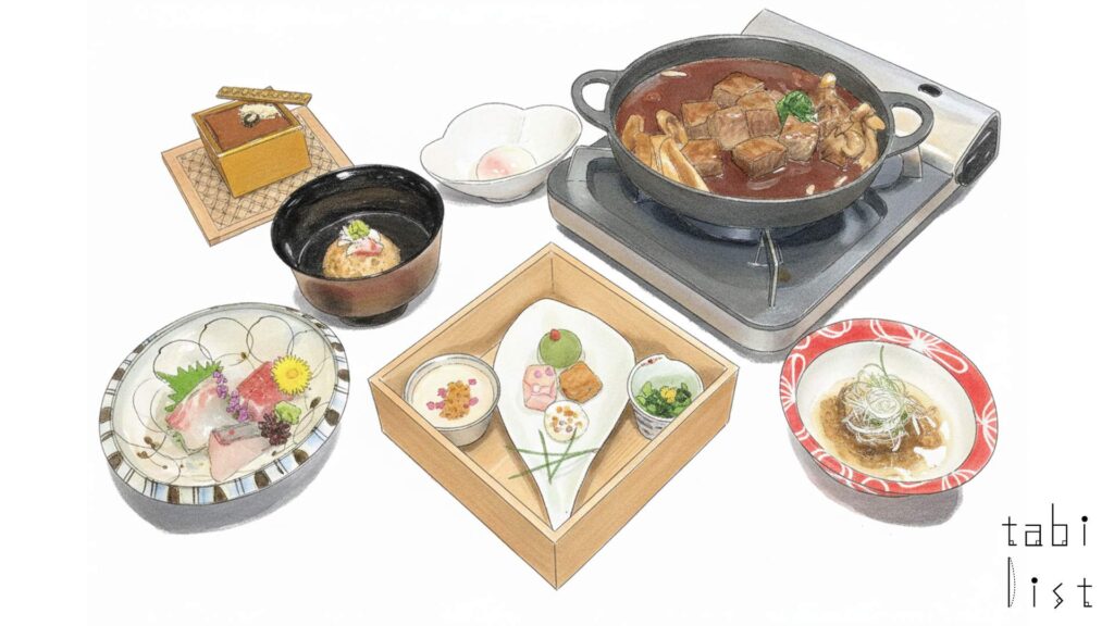 お食事では、箱根の豊かな歴史を味覚で楽しめる趣向が凝らされています。なかでも名物料理として親しまれているのが明治の牛鍋です。これは、明治時代の文明開化とともに広まった牛鍋を、京都の桜味噌を使った特製ダレで仕立てた一品で、とろりとした温泉卵に潜らせて味わう濃厚な旨みが格別です。また、東海道の旅人が荷物を運んだ「挟み箱」を模した器で提供される宝楽盛りは、見た目にも華やかで、小田原や相模湾の海の幸を贅沢に盛り込んでいます。さらに、季節の移ろいを表現した先付けや、仕上げにほうじ茶の香りがふわりと漂うほうじ茶のクリームブリュレなど、最後の一口まで驚きと喜びに満ちた食体験が待っています。