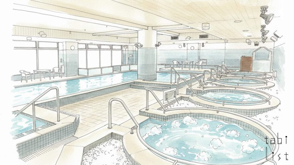 このホテルならではの特色は、水着着用で楽しめる温泉運動浴プール「クアハウス」があることです。ジャグジーや寝湯、うたせ湯など数種類の浴槽があり、天候を気にせず健康増進に役立つ運動浴を満喫できるため、ご家族やカップル皆様で一緒にお楽しみいただけます。また、湯量豊富な伊東温泉の天然温泉を存分に楽しめる趣の異なる2つの大浴場もございます。青々とした植物に囲まれマイナスイオンも感じられる大理石造りの「四季の湯」と、開放的な空間で空を仰ぎながら心地よさを味わえる檜風呂と岩風呂の露天風呂がある「天空の湯」があり、日替わりで男女が入れ替わるため、ご宿泊の際にはどちらの湯も体験できます。泉質はアルカリ性単純温泉で、肌に優しく刺激が少ないため、小さなお子様からご高齢の方まで安心して伊東の名湯に浸かれるのもうれしい点です。大浴場にはサウナも備わっており、旅の疲れを心ゆくまで癒すことができます。