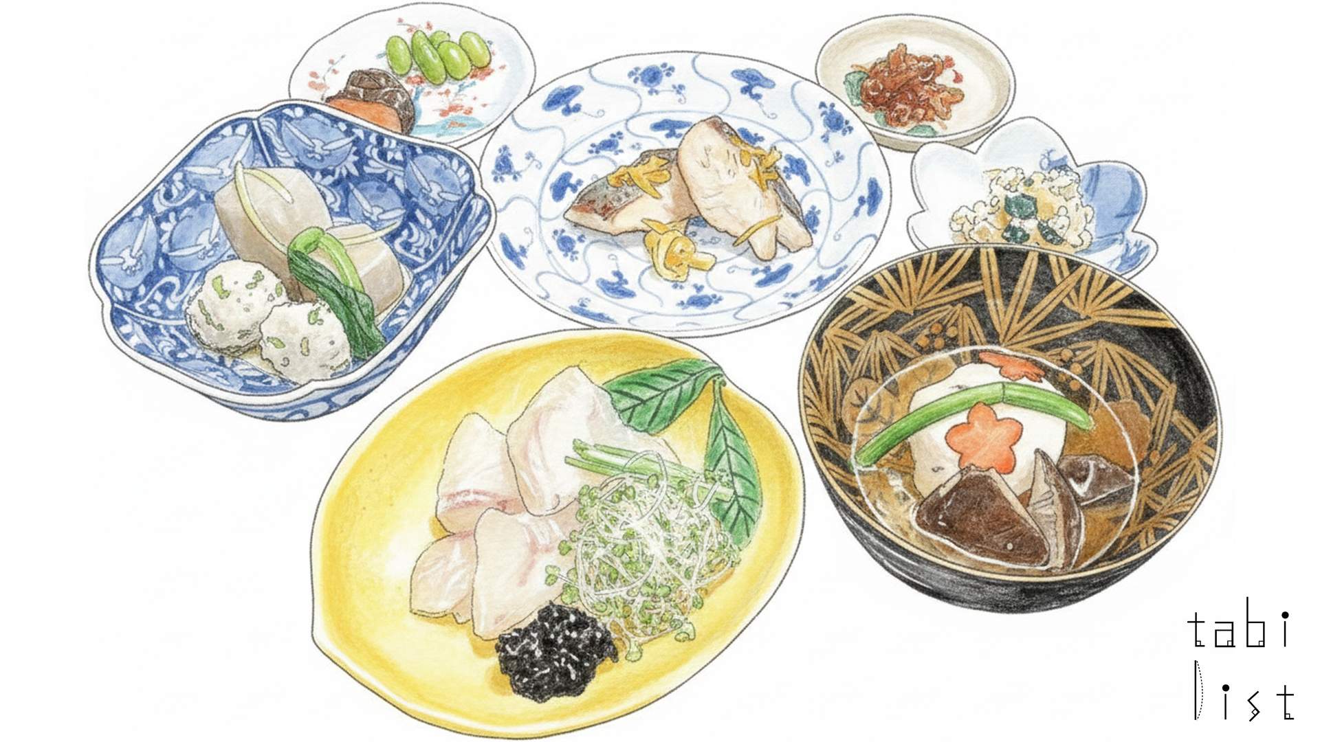 お料理は、店主が培った「生産者と消費者を結ぶのは料理」という理念に基づき、玉島を中心とした地域の農産物や水産物といった地域食材をふんだんに活用した創作懐石料理です。40年の行政経験を持つ店主が、地産地消の推進者として、生産者の思いを消費者に伝える架け橋となりたいという願いが込められた、滋味深く心温まるお料理ばかりです。この創作懐石料理は、店主が趣味で集めた世界で一つしかない貴重な古陶磁器とともに供されます。江戸時代に北前船によって玉島湊に運ばれたかもしれないという歴史を持つ器や、ヨーロッパから里帰りした器なども使用され、器の持つ物語とお料理が相まって、心とお腹の両方を満たす「贅沢」を味わえるのが、備中玉島湊鐡屋 わたしのお茶事 和佳ならではの魅力です。日常ではなかなか使うことのない特別な酒器でおもてなしをされるなど、細部にまで行き届いた心遣いが、特別なひとときを演出しています。お茶事のメインであるお茶はもちろん、これらの料理や器、そして空間全体で、玉島の歴史と文化、そして店主夫妻の温かいおもてなしの心が深く伝わってくる場所です。