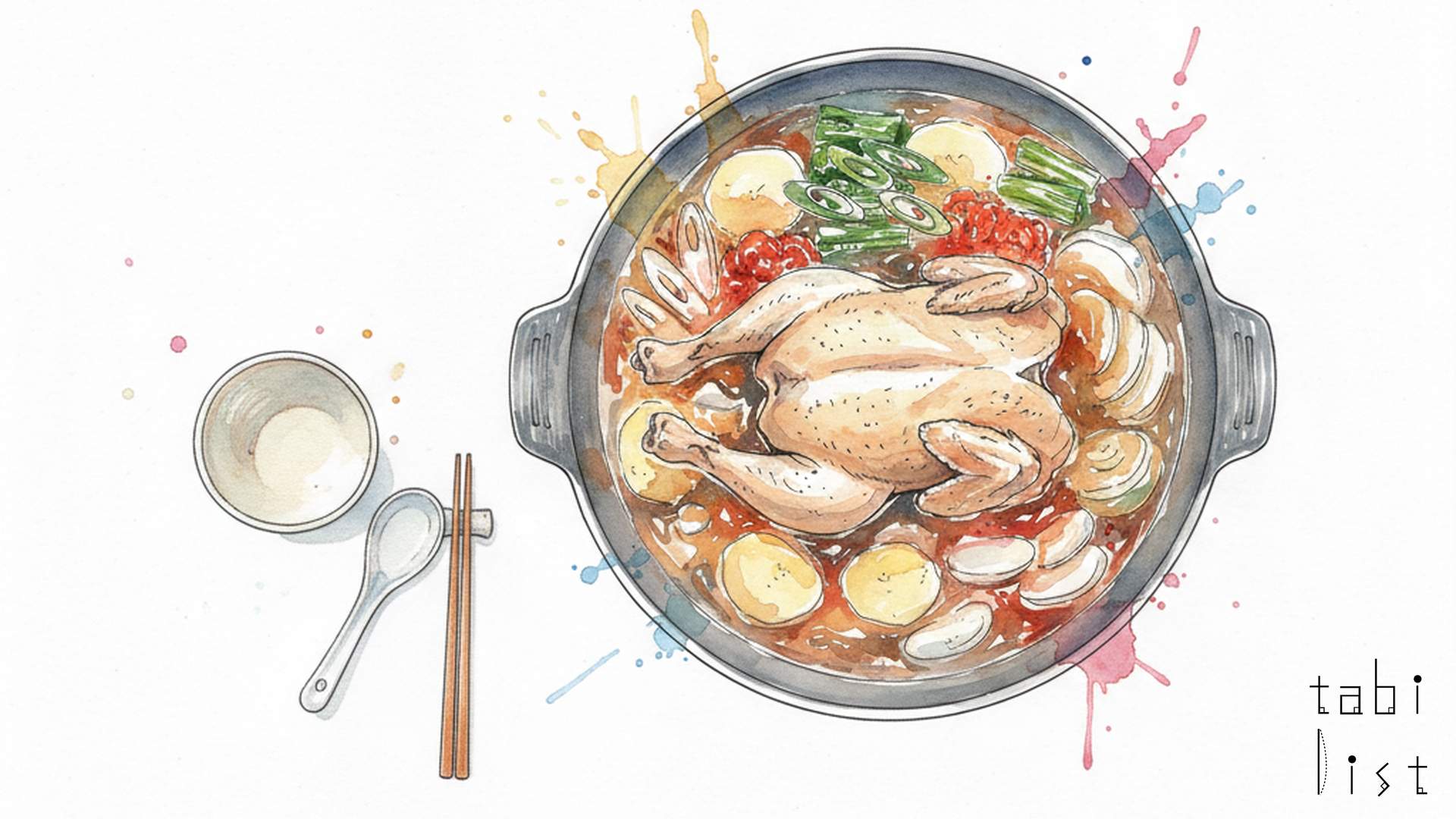 この**陳玉華ハルメ元祖タッカンマリ**ならではの美味しさの秘密は、濃厚ながらもあっさりとした、滋味深いスープに隠されています。何十年もの間、火を絶やすことなく鶏を煮込み続けた「歳月の味」が、この店独自の深いコクを生み出しているのです。毎日使う分の鶏をまとめて煮出して濃い出汁を取り、その日の残りのスープを翌日のベースにすることで、日々旨味が増す原液のようなスープを作り上げています。使用する鶏は、新鮮な生鶏にこだわり、肉質が引き締まって脂分の少ない若鶏(09サイズ)だけを使っていますので、長時間煮込んでも身が硬くならず、ぷりぷりとした弾力のある食感を楽しめます。また、鶏肉にはビタミンやコラーゲンがたっぷり含まれていますので、美容と健康を気遣う女性にも大変喜ばれています。