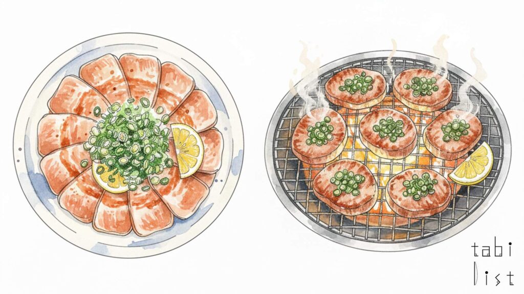 お店を訪れたらぜひ注文したいのが、その名もユニークな名物メニューの「たたみネギタン塩」です。独自の方法で丁寧に下処理されたネギを、特上のタンでまるで畳むように巻いて焼き上げるという、お店の個性が光る一品です。ネギの香ばしさとタンの豊かな旨みが絡み合い、極上の味わいを生み出しています。また、ステーキを思わせるような分厚いカットで提供される「特選厚切りタン塩」も高い人気を誇るメニューです。肉厚で食べ応えがあり、噛むほどにタン本来の濃厚な旨みが口の中に広がります。