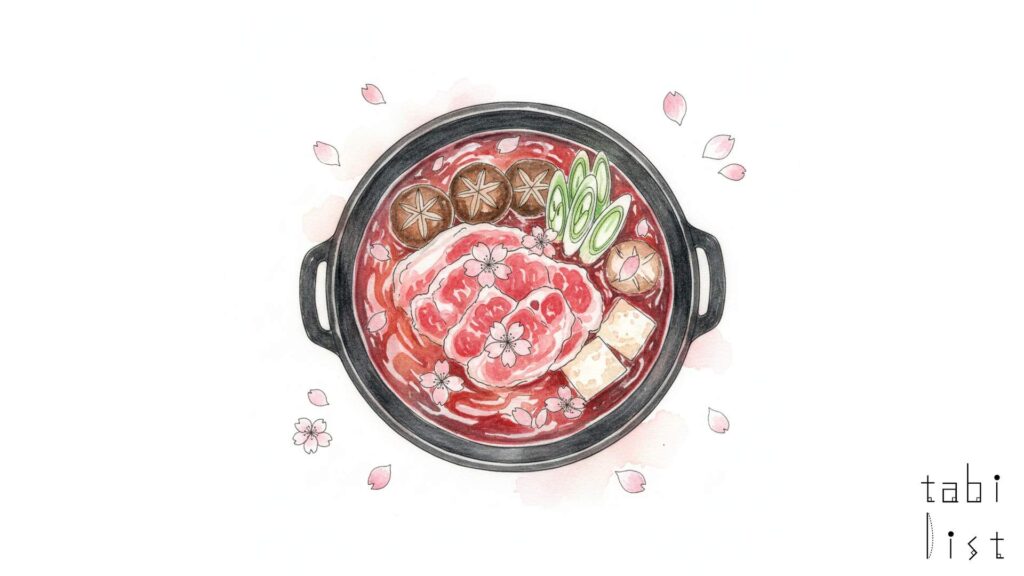 このお店の大きな特徴は、その歴史的な趣を今に伝える建物の造りそのものにあります。店内に一歩足を踏み入れると、長い歴史の積み重ねを感じる安らぎの空間が広がります。二階には、宮大工の職人技が光る「松竹梅に桜」の欄間が見られます。桜なべのお店らしく、松竹梅に加えて桜の彫刻が施されているのはとても珍しい意匠です。また、一階には谷文晁作と伝わる「四季の馬」の絵や、武者小路実篤の詩なども飾られており、まるで博物館のように建築や美術的な見どころがたくさん詰まっています。そして、創業以来大切に守り継がれているのが、看板メニューの桜なべです。このお店で使われている桜肉は、北海道で生まれ九州・久留米の契約牧場で中江専用に肥育された純国産の「極上桜肉」です。特に桜なべに使用する肉は、旨味が濃くなるよう7〜8歳まで通常よりも長い期間かけて穀物中心の飼料でじっくりと育てられています。