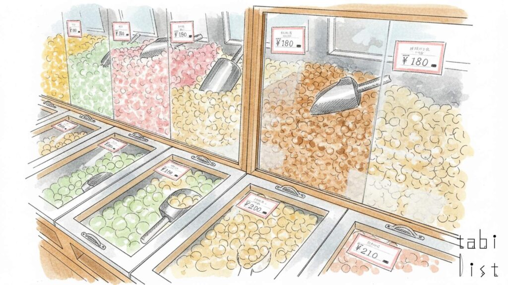 他にも、さまざまな豆菓子が店内の棚を賑やかに彩っています。色とりどりの五色豆は、見た目の可愛らしさだけでなく、豆ごとに異なる食感や味わいの違いを楽しめる一品です。また、香ばしく煎り上げられた豆に砂糖を纏わせた豆菓子の数々は、カリッとした歯ごたえが心地よく、一度食べ始めると止まらなくなる美味しさです。季節によっては、特定の時期にしか出会えない珍しい豆の甘納豆が登場することもあり、訪れるたびに新しい発見があります。素朴ながらも深い味わいを持つお菓子の数々は、石岡の歴史とともに歩んできた職人の真心がたっぷりと詰まっています。
