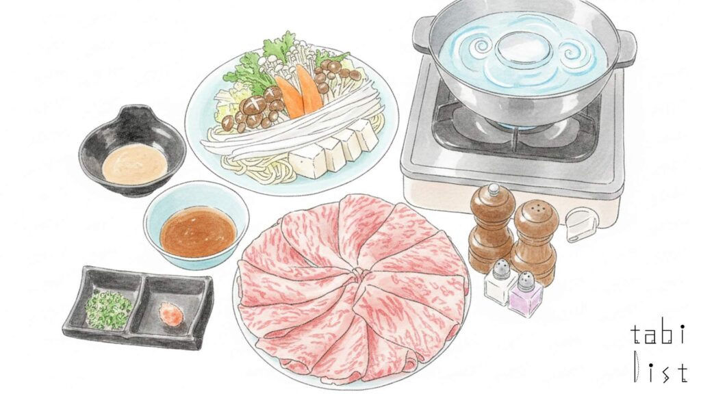 お店の看板メニューは、厳選された山形牛ロース肉を使った山形牛すき焼きです。美しいサシが入ったとろけるようなお肉と、秘伝の割下が絶妙に絡み合い、明治時代から多くの人々の舌を唸らせてきました。すき焼きと並ぶ人気メニューが山形牛しゃぶしゃぶで、こちらも厳選された山形牛のロース肉を使用しています。さっと出汁にくぐらせていただくお肉の繊細な味わいは格別で、〆のおうどんまで楽しめる満足度の高い一品です。さらに、肉本来の旨みを堪能したい方には、山形牛ステーキもおすすめです。お肉のプロが選んだ良質な山形牛を、最高の焼き加減で提供してくれます。