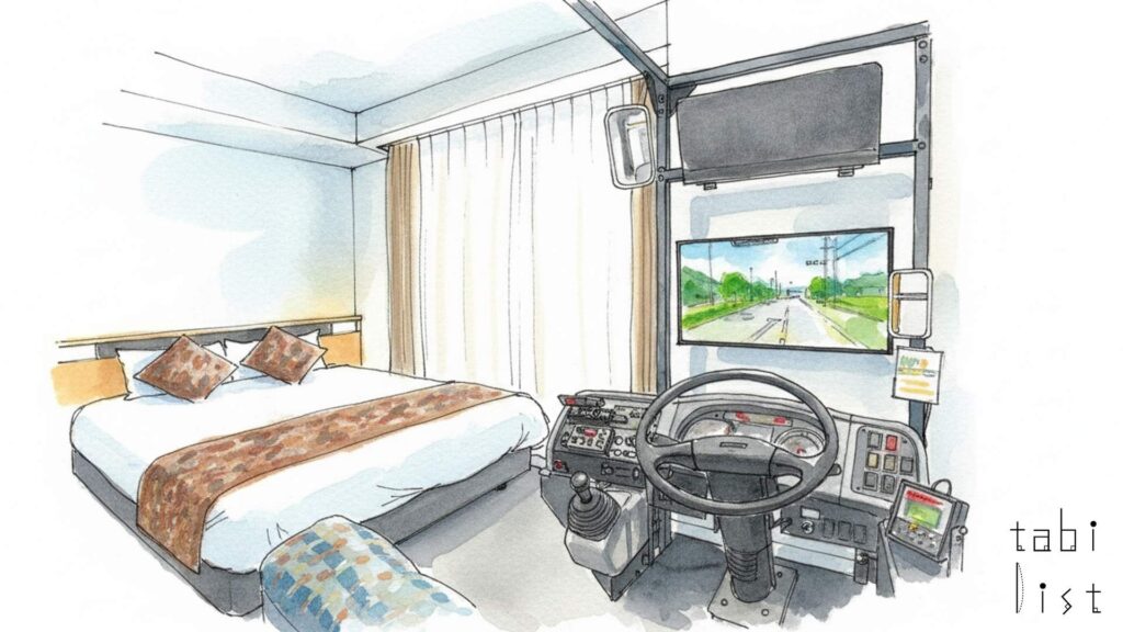 9階にある「別館」専用のフロントとロビーを兼ねたスカイラウンジも、特別な空間です。和モダンを基調とした落ち着いた雰囲気の中で、伊勢市内の景色を眺めながら、ウェルカムドリンクとともにお菓子を味わうことができる「ウェルカムドリンクBAR」が設置されています。旅の計画を立てたり、一日の終わりにくつろいだりするのに最適です。また、別館宿泊者は、隣接する「本館」にある大浴場「人工光明石温泉~四季乃湯~」も無料で利用可能です。弱アルカリ性の人工温泉は湯触りが柔らかく、体の芯から温まり冷え性に効果があると言われています。そして、少しユニークな特徴として、グループ企業である三重交通とのコラボレーションによる、本物のバス運転席を移設した「三重交通バス コンセプトルーム」が1日1室限定で用意されています。