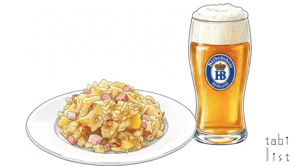 また、ビールと並んでお店の看板を飾るのが、手間ひまかけて作られる本格的なドイツ料理の数々です。なかでも、おすすめしたいのは、豚のすね肉をじっくり煮込んだドイツの伝統的な料理、シュバイネハクセです。お店の看板メニューとして知られ、外側は香ばしく、中は驚くほどジューシーに仕上げられた豚肉は、ボリュームも満点で、芳醇な香りのドイツビールと最高の相性を見せてくれます。