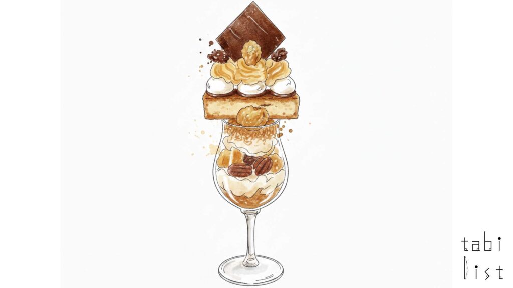 金蜜堂のスイーツは、予約が絶えないパフェ専門店を経営するパティシエの宮副氏が監修しており、そのこだわりは看板メニューの芋パフェに強く表れています。代表的な金蜜芋のお城パフェをはじめとするコレクションは、金蜜芋の美味しさを最大限に引き出すために、甘さや食感、香りのバランスを考え抜かれた、芸術品のような一皿です。パフェを構成するパーツは、多いものでは20種類以上にもなり、一つひとつ手作りされています。モンブランクリーム、手作りチョコケーキ、キャラメル、カスタード、焼きピーカンナッツなど、多彩なパーツが何層にも重ねられ、一口ごとに異なる金蜜芋の豊かな風味と食感の変化を楽しむことができます。これらのパーツは、仕込みに2日間もの時間をかけるという手間を惜しまないことで、高いクオリティを保っています。