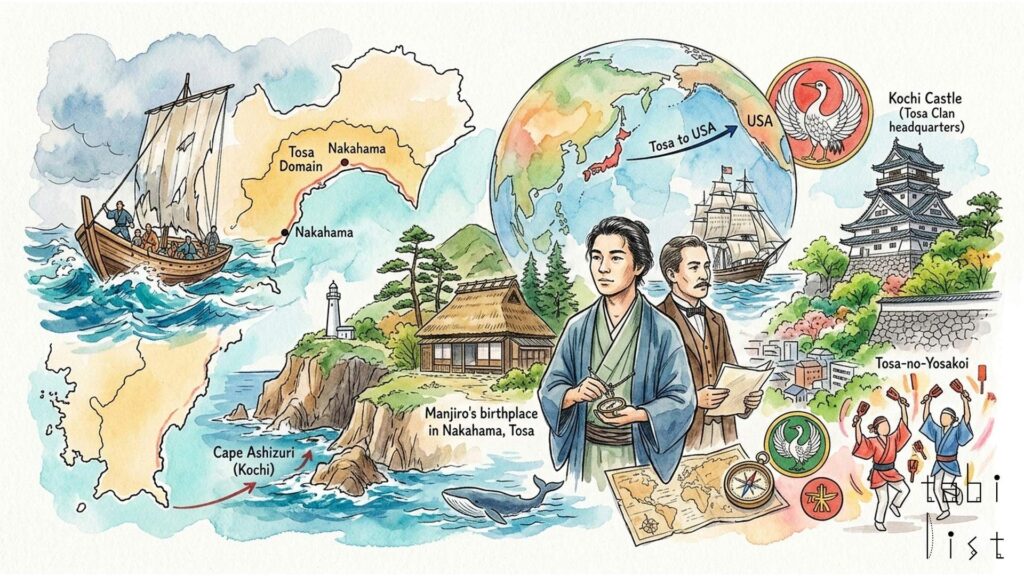 ジョン万次郎の故郷は、高知県土佐清水市中浜(なかのはま)です。宇佐湾から船出した万次郎が生まれたこの中浜地区には、彼の生家が復元され、当時の暮らしぶりを垣間見ることができます。茅葺きの美しい生家は、残されていた写真をもとに2010年に復元されたもので、無料で公開されています。また、万次郎の波乱に満ちた生涯をより深く知ることができる「ジョン万次郎資料館」も、土佐清水市にあります。資料館では、展示やジオラマを通じて、万次郎が経験した漂流やアメリカでの生活、そして日本に帰国してからの活躍を、まるで物語のように感じられます。資料館の近くや足摺岬には、海を見つめるジョン万次郎の銅像も立っていて、訪れる人々に大きな感動を与えています。