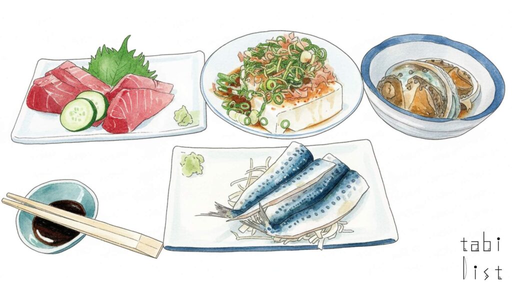 湯豆腐と並んで人気を集めるのが、地元の新鮮な魚介を使った刺身の盛り合わせです。伊勢の地に揚がる旬の魚の美味しさを堪能でき、地酒と一緒に楽しむのもおすすめです。また、伊勢ならではの珍味として知られる鮫たれ(サメタレ)も人気メニューの一つです。サメの身を干して作るこの郷土料理は、独特の風味と食感があり、お酒の肴にぴったりです。