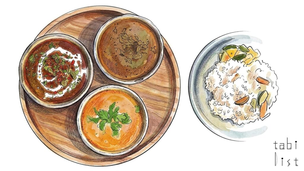 お店のメニューには、定番で人気の「チキンカレー」や、彩り豊かで見た目も楽しい「野菜カレー」などがございます。特に女性のお客様には、まろやかな味わいが特徴の「野菜とチーズのキーマカレー」がとても人気を集めているそうです。カレーに使用されるお米は厳選された国産コシヒカリで、その一粒一粒がカレーの風味を一層引き立てます。さらに、テーブルにはお店オリジナルのガラムマサラやハラペーニョパウダーが置かれていて、お客様ご自身の好みに合わせて辛さや香りを調節しながら、何度でも新しい味の発見を楽しめます。
