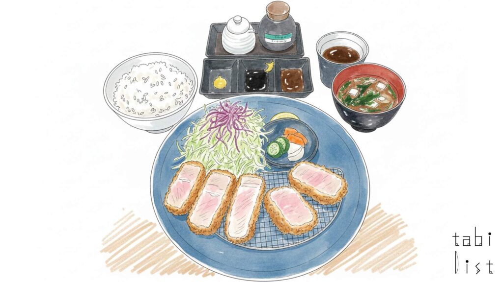 最大の特徴は、まるでおしろいを纏ったかのような美しい白ヒレかつです。使用されるのは、岩手県産の最高級銘柄豚であるSPF岩中豚などの厳選された豚肉。これを低温の油でじっくりと時間をかけて熱を通し、最後に余熱で肉の旨味を閉じ込めることで、衣を焦がさず白く仕上げています。サクッと軽い衣の中に隠されたお肉は、ほんのりとした桜色で、箸で持ち上げるだけで肉汁が溢れ出すほど瑞々しく、驚くほどの柔らかさです。