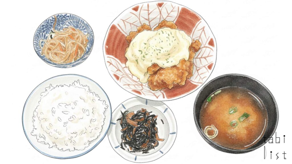 人気の定食メニューは多岐にわたりますが、特に「さばの塩焼き定食」や「さばのみりん干し定食」などの焼き魚定食は、脂ののった魚の旨みがごはんによく合い、多くのお客様に愛されています。また、やわらかな若鶏を丁寧に揚げた「若鶏のから揚げ定食」も、世代を問わず人気の高い一品です。お料理は化学調味料を使わず、出汁をしっかりとるところから丁寧に作られており、どれも優しい味付けで、ごはんとの相性も抜群です。
