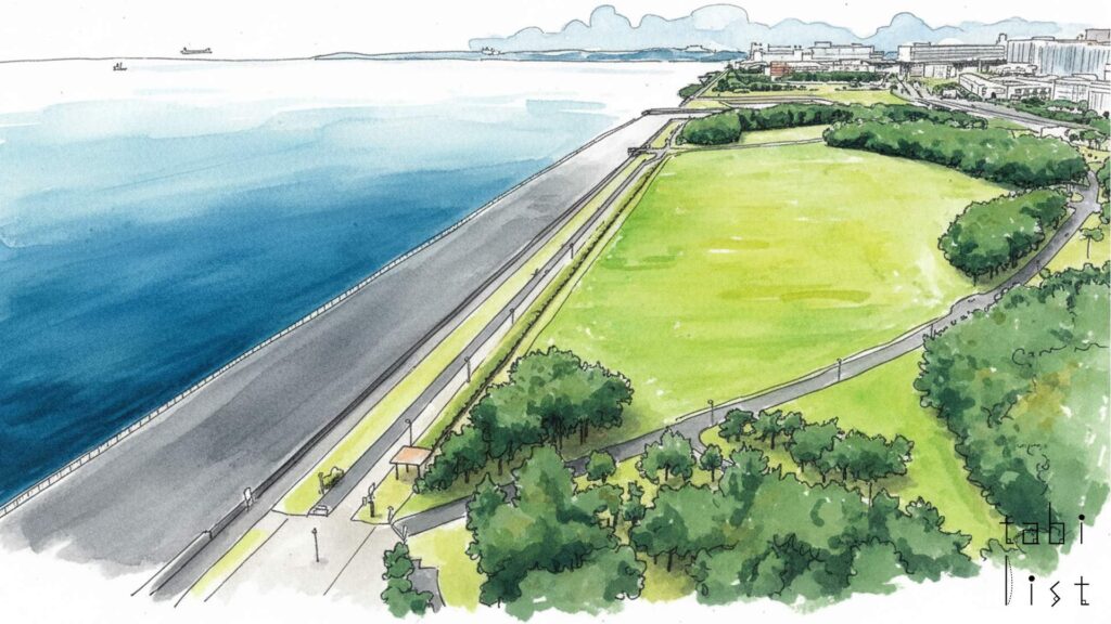この公園の一番の魅力は、何といってもオーシャンビューという最高のロケーションです。園内にはヤシの木が多く植えられていて、まるで南国リゾートに来たかのような、おしゃれで開放的な雰囲気に包まれます。公園の東側にある入口では、黒い壁を水が伝って流れる壁泉が優しくお出迎えしてくれます。天気の良い日には、遠くの房総半島や東京湾アクアラインまで見渡せる、美しい海の眺めを堪能できます。園内をぐるりと一周できる遊歩道が整備されていますので、潮風に吹かれながら、ゆったりとした時間を過ごす散策は心と体をリフレッシュさせてくれるでしょう。