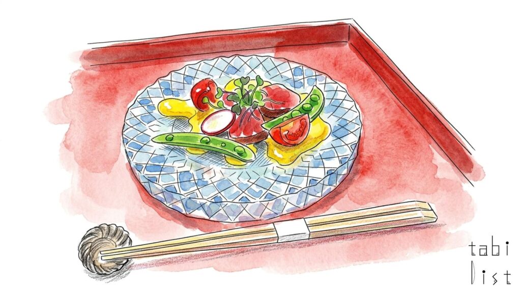 お食事は、ランチとディナーともに、旬の食材をふんだんに使った月替わりのコース料理をご用意しています。例えば、ある日のランチコースでは、新鮮な海の幸を彩り豊かに盛り付けたお刺身のサラダ仕立てや、季節ごとの素材の持ち味を生かした優しい味わいの季節の茶碗蒸しがお目見えすることもあります。メイン料理には、その日に仕入れたばかりの新鮮な魚を丁寧にポワレにした本日の鮮魚 ポワレが提供され、彩り豊かに盛り付けられています。コースの締めくくりには、鶏白湯のライスヌードルのような、心温まるお食事が登場することもあります。