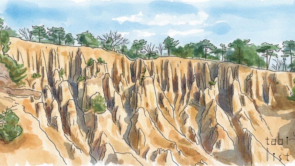 徳島県阿波市にあります阿波の土柱は、大自然が長い年月をかけて作り上げた、まさに地球の芸術作品と呼べる場所です。砂や小石が堆積してできた地層が隆起し、雨や風によって削られて現在の柱のような形になった、珍しい侵食地形をご覧いただけます。
