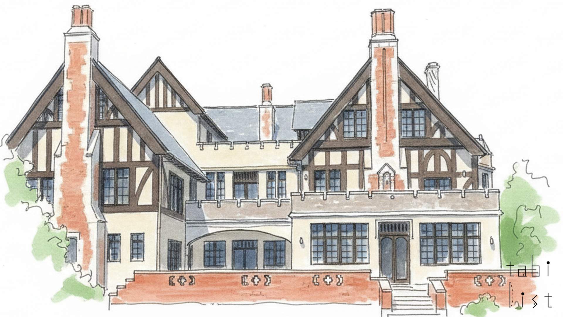 大丸ヴィラは、ロンドンのリバティ百貨店の外観に感銘を受けた下村正太郎さんのご意向を受け、イギリスのチューダー様式という建築スタイルで造られました。当時、洋館が日本風に変化していく中で、純粋なイギリス様式を保っていることから「中道軒(ちゅうどうけん)」とも呼ばれています。鉄筋コンクリート造でありながら、外壁には太い柱型を見せるハーフティンバーという技法が使われ、まるで木造建築のような温かみを感じさせます。急勾配の瓦屋根には、煉瓦積みの煙突がいくつも設けられており、その姿は遠くから見ても印象的です。外壁には、昭和初期に流行した細かい溝模様が特徴のスクラッチタイル(泰山タイル)が用いられ、細部にまでこだわりが光ります。