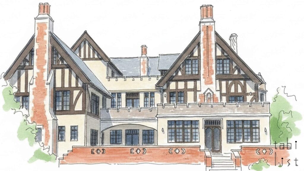 建物の内部には、豪華な玄関ホールや、幾何学模様が美しい天井の居間、そして印象的なマントルピースのある食堂など、見どころがたくさんあります。特に談話室には、下村さんの頭文字である「S.S」と家紋の「並び鷹の羽」が施されたステンドグラスがあり、チューダー様式の空間に日本の意匠が融合したユニークな趣を感じられます。