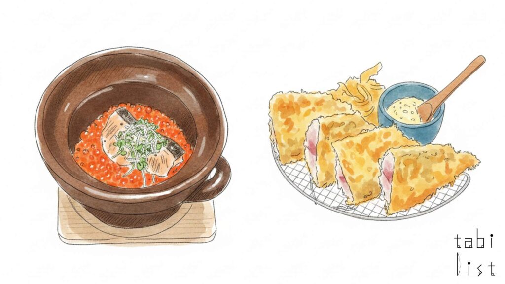 こちらのお店の看板メニューは、なんと言っても~重さゼロ!~アジフライです。長崎県松浦市から直送される新鮮な生食用のアジを使い、衣の量を一般的なアジフライの半分以下に抑えて揚げられています。この特別な製法によって、驚くほど軽やかな食感に仕上がっているのですよ。アジフライは、短時間で揚げたしっとりとした「半熟」と、しっかりと火を通した「完熟」の二種類から選べるのも楽しいですね。ニラ醤油や塩とわさびで味わうのがおすすめで、付け合わせにはさっぱりとした赤酢漬けのキャベツが添えられています。