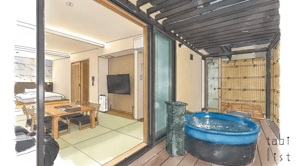 秩父小鹿野温泉旅館 梁山泊の大きな魅力は、全15室すべてに客室露天風呂が備わっていることです。四季折々の秩父の自然を眺めながら、周りを気にすることなく、いつでもお好きな時に温泉を楽しんでいただけます。お部屋はそれぞれ趣の異なる和洋室で、上質な空間が広がります。シモンズ社製のマットレスが用意されており、快適な眠りをお約束しています。また、ビールやウイスキー、ソフトドリンクなどが自由に楽しめるフリードリンクバーが館内に常設されており、オールインクルーシブで贅沢な滞在をお過ごしいただけます。