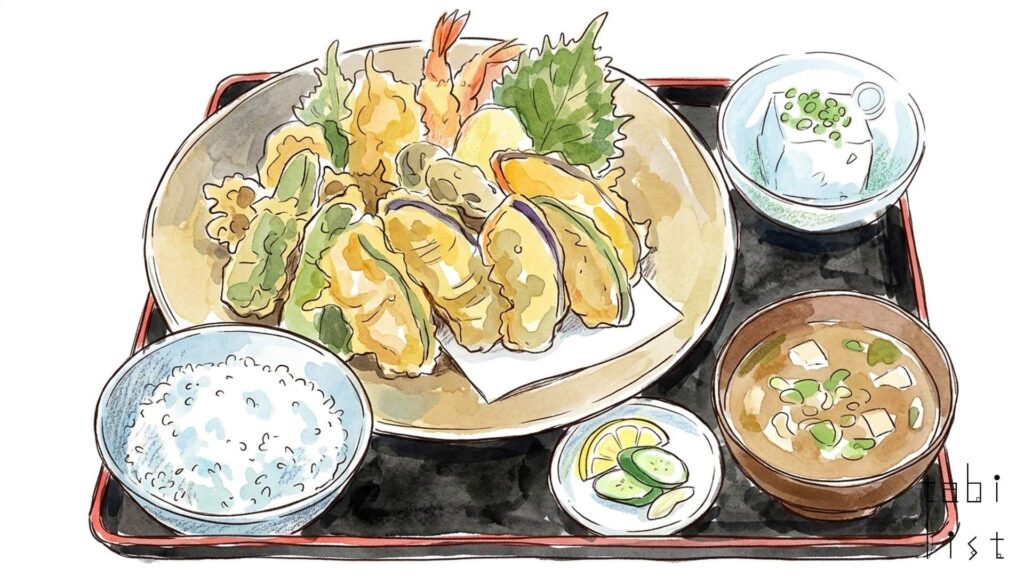 また、お食事の選択肢が豊富な点も、和食ダイニング 和心 本店が愛される理由の一つです。麺類では、天ぷらがのった天丼も提供されています。旬の食材を活かした天ぷらは、サクサクとした食感と素材の旨みが感じられる一品です。和食の定食メニューも充実しており、その日の気分に合わせて、様々な日本の味覚を堪能できるのも嬉しいですね。