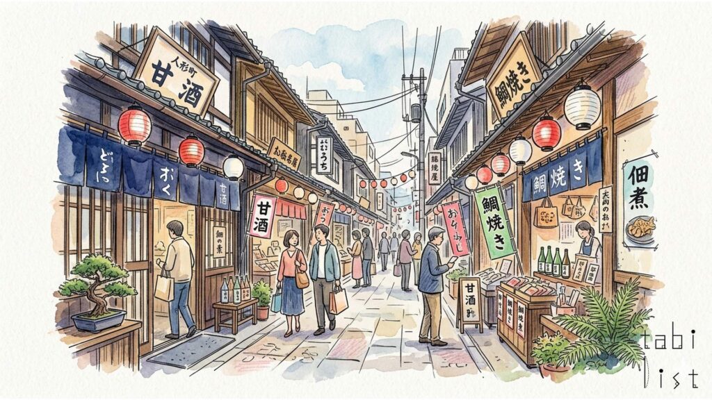 地元に長年愛される、人形町の手焼き煎餅のお店、にんぎょう町草加屋さんです。東京メトロ日比谷線の人形町駅から歩いてすぐの甘酒横丁にあり、通りに面したガラス窓からは、職人さんが備長炭で丁寧に煎餅を焼いている様子が見えることがあります。これはまるで昔ながらの日本の手仕事を見ているようで、多くの人々の心を惹きつけます。