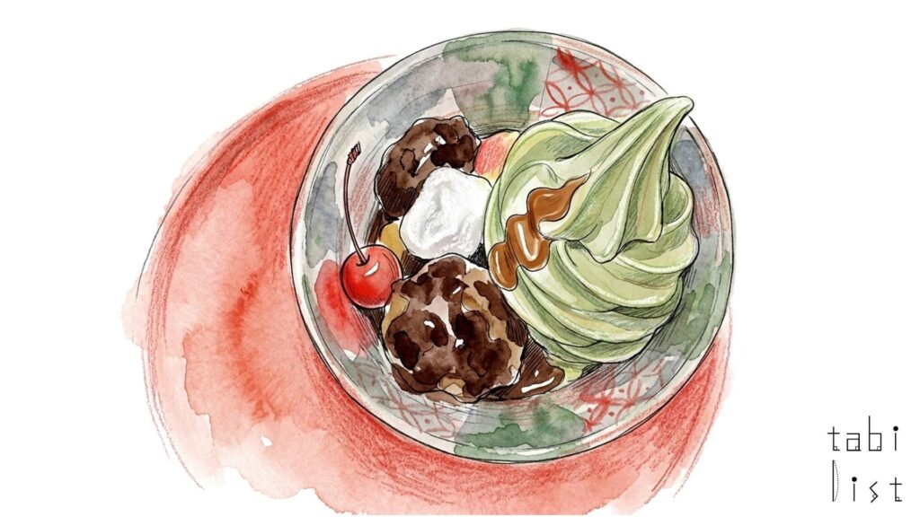 純喫茶マウンテンで特に人気を集めているのは、昔ながらの味わいが楽しめるクリームあんみつです。甘すぎないあんこと冷たいソフトクリーム、そしてもっちりとした白玉の組み合わせが絶妙で、お店の看板メニューとして多くの人に選ばれています。