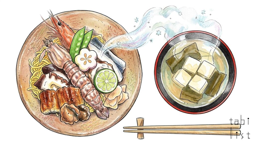 大正亭の大きな特徴は、なんといっても岡山県ならではの「食の歴史遺産」を味わえることにあります。特に、岡山県の代表的な郷土料理である岡山ばら寿司は、日本遺産「一輪の綿花から始まる倉敷物語~和と洋が織りなす繊維のまち~」を構成する文化財の一つとして認められています。色とりどりの海の幸と山の幸がふんだんに盛り付けられたその姿は、まるで花束のように華やかで、まさに食べる歴史遺産と呼ぶにふさわしい一品です。この岡山ばら寿司には、炙り鰆やままかりの酢漬け、穴子や海老、シャコ、下津井港で水揚げされたタコなど、瀬戸内の恵みが惜しみなく使われています。さらに、筍や蓮根、椎茸、菜の花といった山の幸も加わり、甘めの優しい味わいの酢飯の上に錦糸玉子がたっぷりと敷き詰められています。