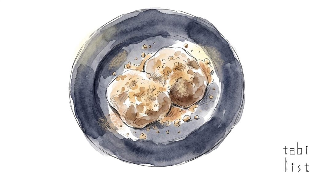ツバメヤ 日本橋店では、お店の中で毎日心を込めて手作りされた、できたてのお菓子が三種類並びます。特に人気を集めるのが、名物のわらび餅です。みずみずしさを閉じ込めるように一つずつ丸く手切りされており、口に入れるととろけるような繊細な食感が広がります。このわらび餅には、沖縄県波照間島産の純黒糖が隠し味に使われていて、上品で奥深い甘さが感じられます。たっぷりとかけられているきな粉は、北海道産の大豆「とよまさり」をこのわらび餅のためだけに特別に焙煎したもので、大豆本来の豊かな香りと甘みが楽しめます。