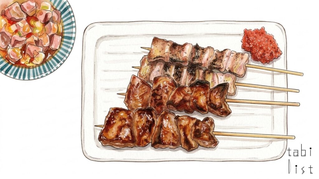 このお店の大きな特徴は、毎朝芝浦の食肉市場から直接仕入れる新鮮な豚もつを、一本一本丁寧に串打ちして炭火でじっくりと焼き上げている点です。新鮮な素材を職人さんの技で仕上げていますので、部位ごとの旨味を存分に味わえるのが魅力です。味付けは、もつの種類に合わせて塩や自家製ダレなどを使い分けていらっしゃるそうですので、様々な味のハーモニーを楽しむことができます。もつ焼きの他にも、お刺身や麺類、一品料理など、お酒に合うお料理がたくさん揃っていますよ。