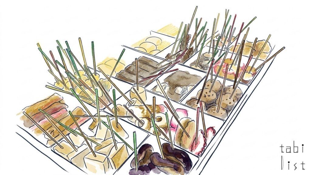 ふくや食堂の大きな特徴は、なんといってもお店の中央にどっしりと構えるおでん鍋です。湯気立つお鍋には、じっくりと出汁がしみ込んだ具材が20種類ほど並んでいます。訪れるたびに異なる具材を選ぶ楽しみがあり、優しく奥深い味わいは、心も体もじんわりと温めてくれます。お会計の際には、奥さんが年季の入ったそろばんで、おでんの串の本数を数えて計算してくださいます。その手際の良い珠の音も、お店の風情を一層引き立てる素敵な光景です。このお店は、新しい時代を生きる人々の生活の場として多様な店舗が建ち並んだ歴史あるエリアにあり、その趣きを今に伝えています。
