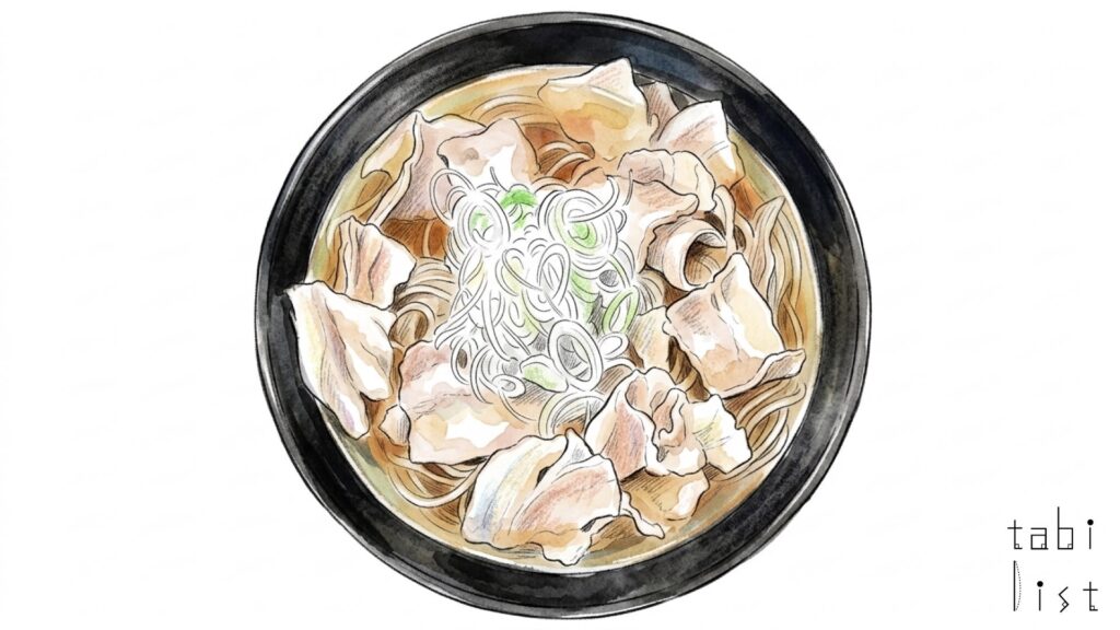 心で特に人気を集めているのは、たっぷりの豚バラ肉がのったもりもり肉そばです。おそばが見えなくなるほどお肉が盛られており、一口食べればお肉の旨味と甘めのつゆが絡み合い、心もお腹も満たされます。麺は、お好みに合わせて「普通麺」と、そばの風味をより感じられる「乱切り麺」の2種類から選ぶことができます。