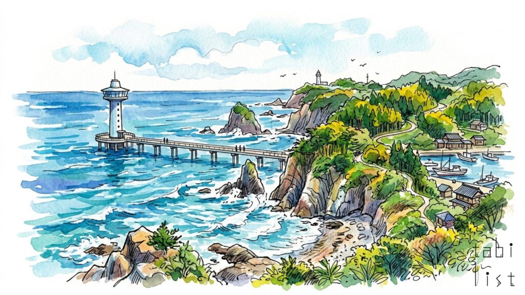 官軍塚展望台の最も大きな魅力は、目の前に広がる180度のパノラマで、雄大な太平洋を心ゆくまで眺められることです。特に、水平線から昇る初日の出を見るスポットとして大変人気があり、多くの人々が新しい年の始まりをこの場所で迎えています。また、ここはお花見の名所としても知られていまして、2月下旬ごろになると、一足早く河津桜が咲き始めます。展望台へと続く遊歩道は、満開の時期にはまるで桜のトンネルのようになり、濃いピンク色の桜と青い海のコントラストが織りなす景色は、他ではなかなか見られない美しさです。敷地内には、歌人である斎藤茂吉が勝浦の港の様子を詠んだ「ひく山は重りあひておのづから小さき港と成りゐたりける」という歌碑も静かに佇んでいます。