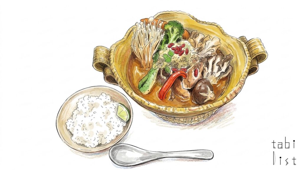 「幕末カリー」ならではの大きな特徴は、スープカレーが特注の土鍋で提供されることです。一つ一つ手作りの土鍋は、料理を最後まで熱々のまま味わうことができます。店内では、この素敵な土鍋が展示・販売されていることもあります。オープンキッチンを囲むコの字型のカウンター席が設けられており、目の前でシェフが野菜を丁寧に揚げ、調理する様子を見ることもでき、お食事を待つ時間もわくわくする体験になります。使われる野菜は、自社農園で無農薬・無化学肥料で育てられた日本古来の在来種で、その時期にとれた旬の野菜が10種類から12種類も彩り豊かに盛り付けられます。野菜本来のしっかりとした濃い味わいを感じられるのが魅力です。