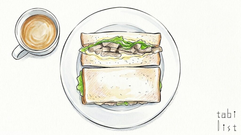 そして、お寿司と並んで特に目を引くのが、その名も「ポパイ」というボリューム満点のサンドイッチです。この「ポパイ」サンドイッチは、レタス、豚ひき肉、チキン、ほうれん草、卵など、彩り豊かで具だくさんの食材がたっぷりと挟まれており、少しピリ辛の味付けが食欲をそそる一品です。これ一つでお腹がいっぱいになるほどの満足感があると言われています。お持ち帰りもできるようですので、勝浦の美しい景色を眺めながらいただくのも素敵ですね。その他、店内ではスパゲッティやクレープなども取り扱っていることが情報として見受けられます。多様なメニューが揃う「めんこい亭」さんは、訪れるたびに新しい発見があるかもしれません。