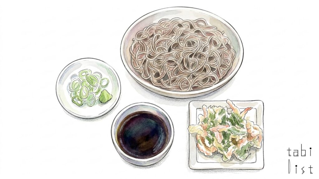 夜の立ち飲み酒場としての時間には、おつまみメニューも充実しています。中でも、くじら刺しは立ち食いそば店では珍しい逸品です。新潟では古くから鯨を食べる文化があり、こちらのくじら刺しは、臭みがなく、口に含むと舌の温度でじんわりと脂が溶け出すような、柔らかく滋味深い味わいをお楽しみいただけます。定番のもり・かけそばや、たぬき・きつねそばといったおそばも、布海苔で打たれた独特のそばの風味を存分に味わえる人気メニューです。その他にも、温かいにしんそばも提供されており、多くのお客様に選ばれています。