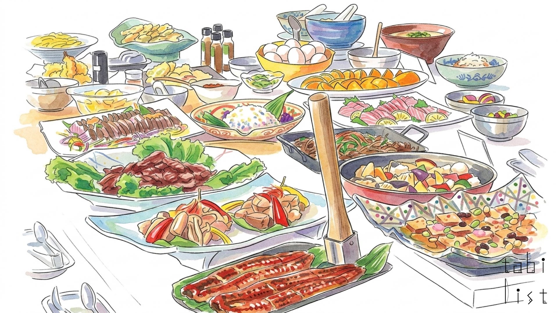 お食事では、地元大分の旬の恵みをふんだんに使ったバイキングスタイルをご用意しています。特にご好評をいただいているのは、ランチタイムに楽しめる5つ星贅沢丼ランチバイキングです。こちらでは、鰻やステーキ、海鮮、揚げたての天ぷら、そしてとろけるような自家製チャーシューといった5種類のメイン具材の中から、お客様のお好みに合わせて自由に盛り付け、自分だけのオリジナル丼を作ることができます。季節ごとの様々なお料理やデザートも豊富に揃っており、何度訪れても新しい美味しさに出会える工夫が凝らされています。