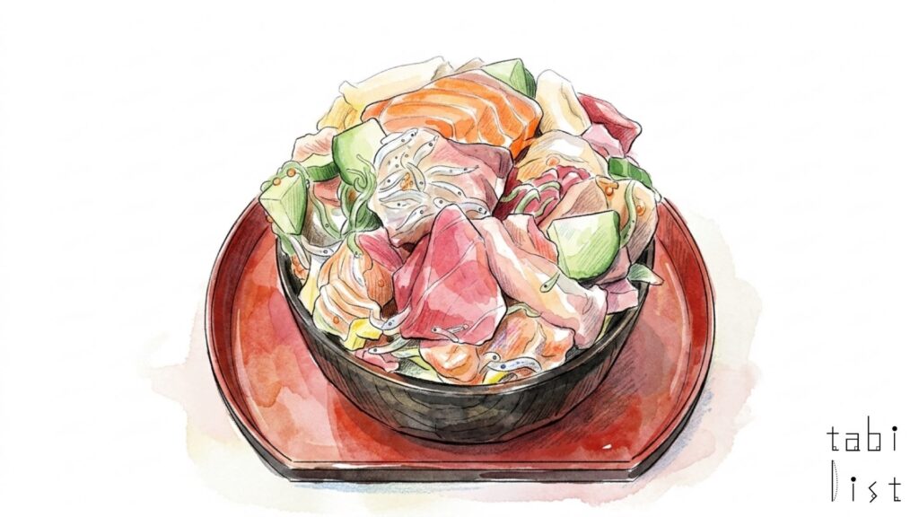 お店に訪れる多くの人が注文する人気の品が、こぼれ海鮮丼です。運ばれてきた瞬間、思わず声を上げてしまうような驚きの仕掛けがあり、丼の上にもう一つの丼が蓋のように被せられた状態で提供されます。その蓋を開けると、中からはキラキラと輝く海鮮が溢れんばかりに盛り付けられており、まさに「こぼれ」という名にふさわしい迫力です。マグロやサーモン、イカなどの新鮮なネタは、最後までおいしく食べられるようにと絶妙な塩梅で「漬け」にされており、一口ごとに異なる魚の旨味と食感を楽しむことができます。