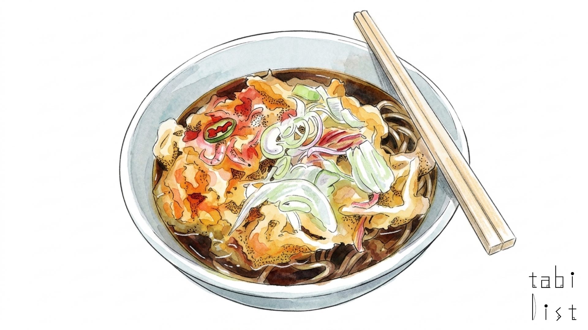 春菊天そばは、ほろ苦さと香りのバランスが絶妙で、落ち着いた味わいを求める方に好まれています。さらに、しっかりとした満足感を求めるならコロッケそばも外せません。時間とともにおつゆに溶け込むコロッケの甘みが、味にやさしい変化をもたらします。麺はうどんに替えることもでき、その日の気分で選べる自由さも嬉しいところです。
